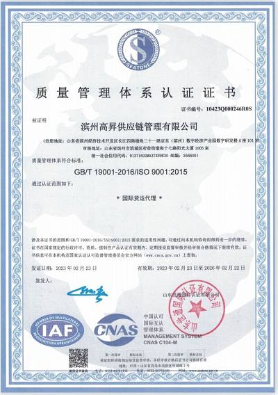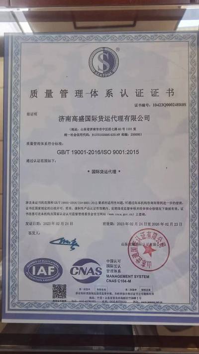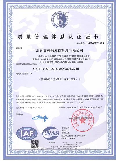 Gaosheng International Logistics (www.gaosheng56.com) является первоклассным экспедитором, одобренным Министерством торговли, и общественным перевозчиком, не эксплуатирующим суда (NVOCC), одобренным Министерством транспорта. Он прошел систему сертификации качества ISO9001 и получил расширенную таможенную сертификацию AEO (AEOCN371298078J). Компания стремится интегрировать преимущества железнодорожного, морского, воздушного, наземного транспорта, складирования, торговли и ресурсов цепочки поставок, а также использовать цифровые технологии для создания новой мультимодальной универсальной сервисной платформы с возможностью сотрудничества в реальном времени, которая может предоставить клиентам с дополнительными услугами.